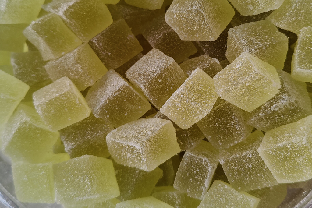 Storleken på marmeladkuberna är ungefär 2 x 2 x 1,5 cm